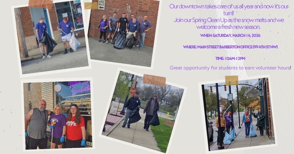 Join Main Street Barberton for our Spring Downtown Clean Up on Saturday, March 14, 2026, from 10:00 AM–12:00 PM. We’ll meet at the Main Street Barberton office (99 4th St NW) and head out together to freshen up downtown as the snow melts and we welcome the new season. It’s a simple, hands-on way to give back, connect with neighbors, and help keep Barberton’s historic downtown looking its best—plus it’s a great opportunity for students to earn volunteer hours.