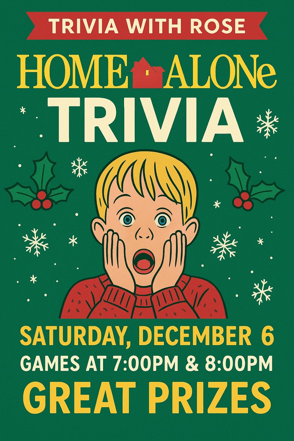 Home Alone trivia December 6th at 7 PM and 8 PM. This is an ugly Christmas sweater party! There will be a prize for the best sweater and prizes for trivia.