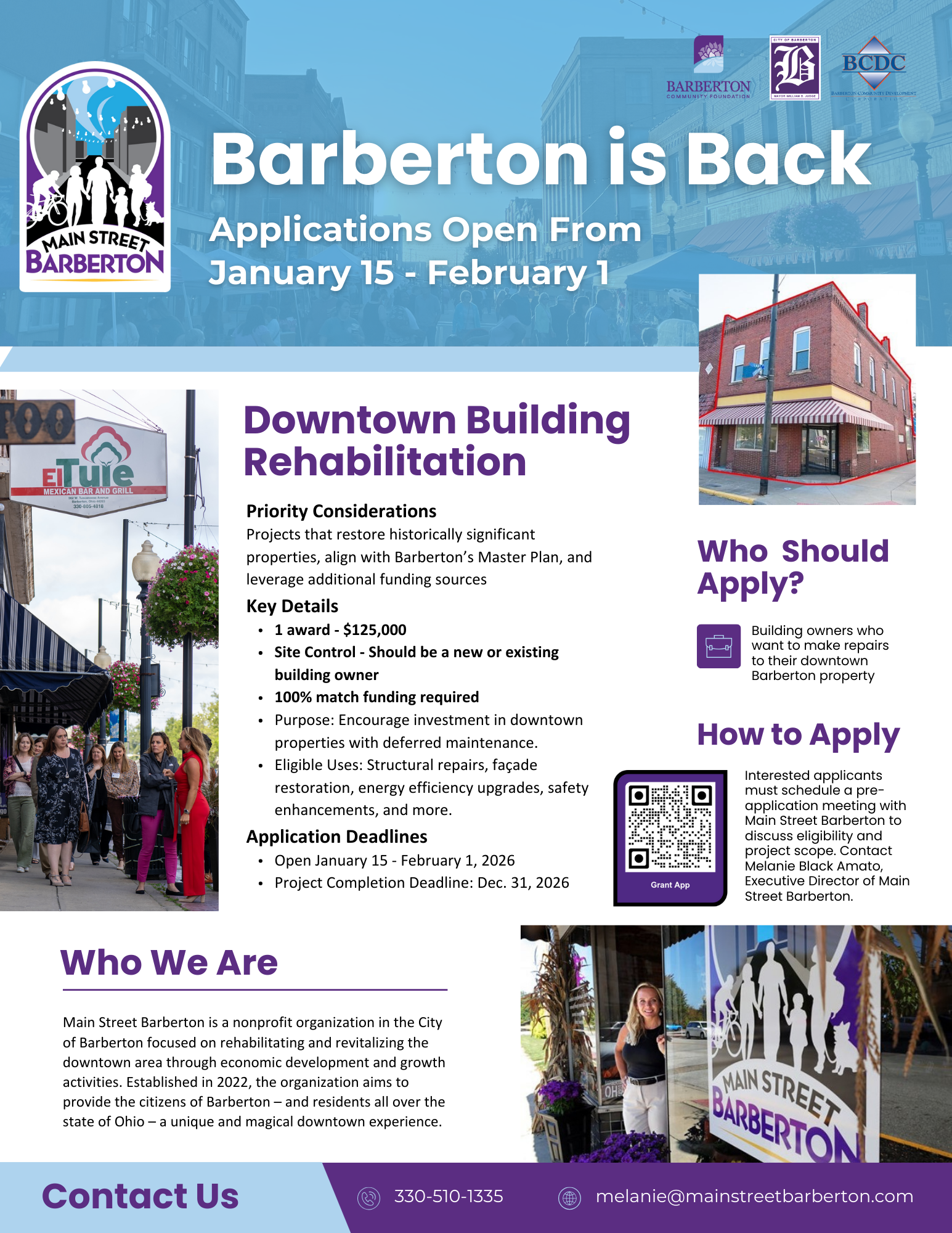 Interested applicants for either program must schedule a pre-application meeting with Main Street Barberton to discuss eligibility and project scope.